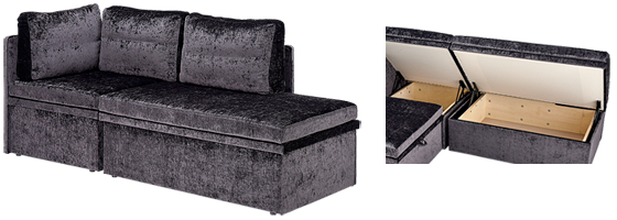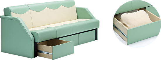 家庭用デザインとしては最深を誇るソファベッドです。収納庫を開ける際に背を倒す必要が無く、置きクッションを取り除き座面をあげるだけで開口できることもLDBの魅力の一つです。