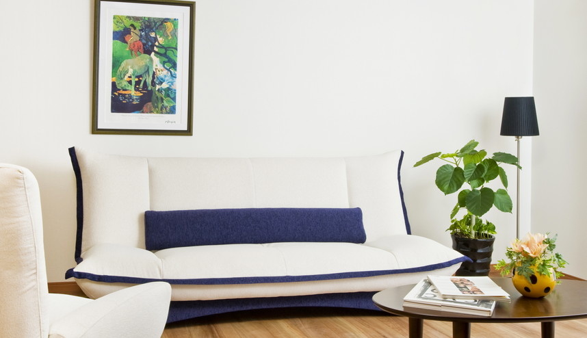 ソファベッドに見えないスタイリッシュなデザインでありながら、人間工学に基づき、ソファ時には座角度5度の傾斜を設け、さらに腰部分にサポートクッションを置くことで、すわり心地をより良くしています。